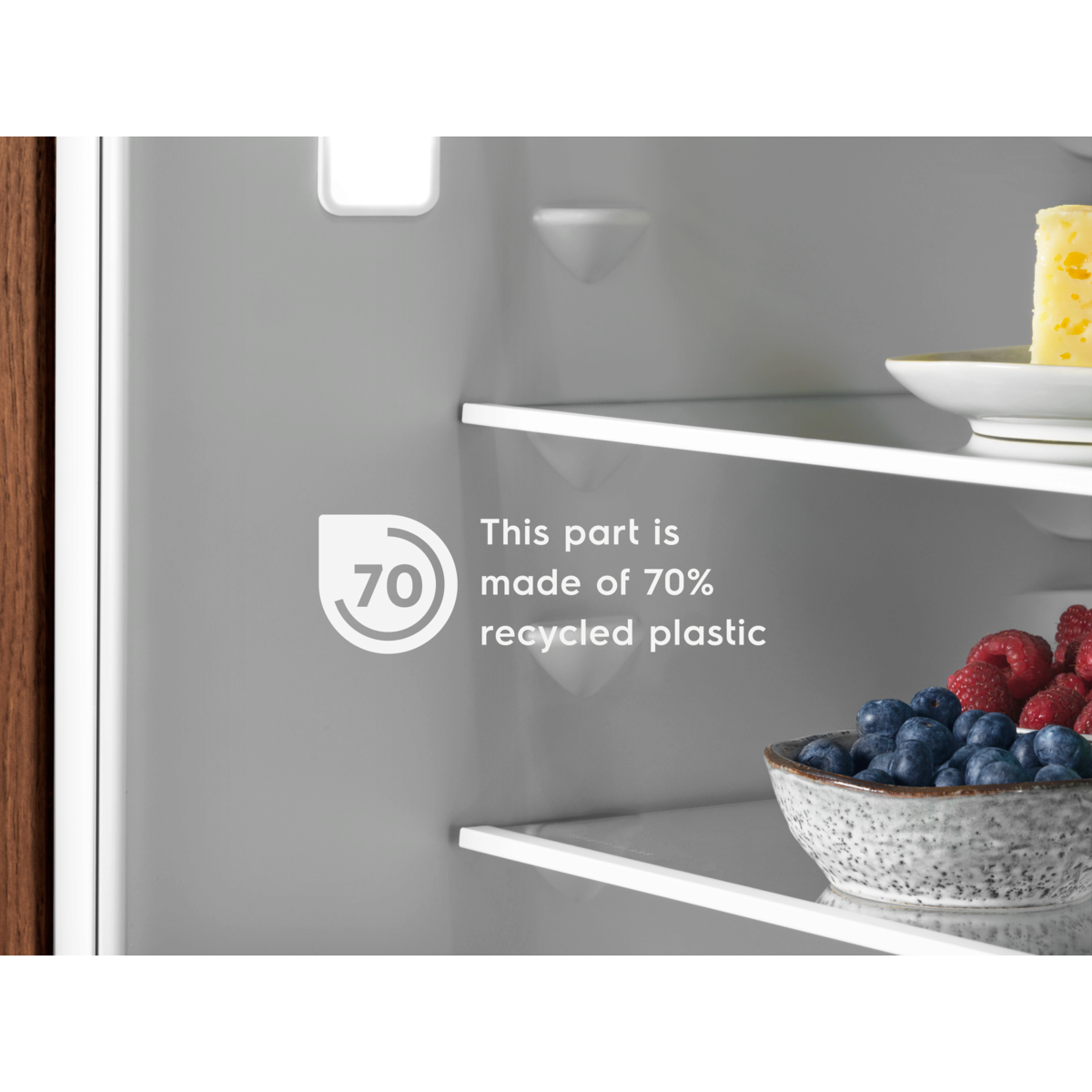 * Das Material der Innenauskleidung besteht zu 70 % aus recyceltem Kunststoff, insgesamt sind das 13 % des gesamten im Kühlschrank verbauten Plastiks.